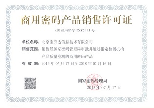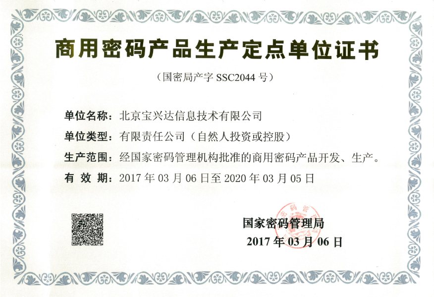2017年3月6日,北京宝兴达信息技术有限公司正式获得由国家密码管理局颁发的《商用...